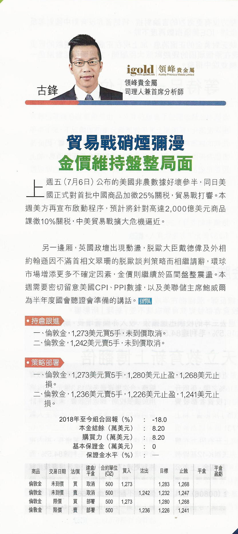另一边厢,英国政坛出现动荡,脱欧大臣戴德伟及外相约翰逊因不满首相文翠珊的脱欧谈判策略而相继请辞,环球市场增添更多不确定因素,金价则继续于区间盘整震荡。本周需要密切留意美国CPI﹑PPI数据,以及美联储主席鲍威尔为半年度国会听证会准备的讲话。