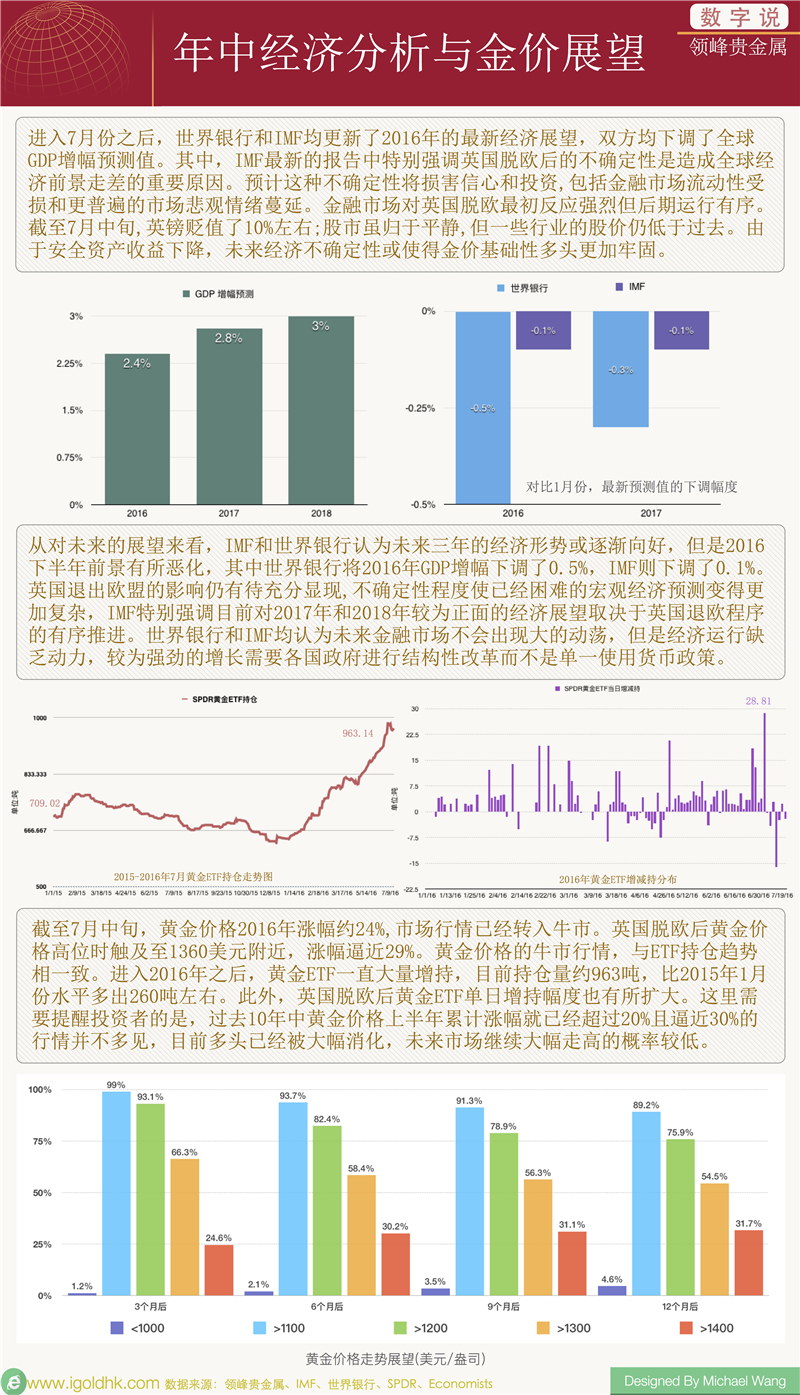 我们在上几篇专题中,已经就英国退欧后可能的影响进行了深入分析。IMF在上周更新的2016年经济展望中也对这一议题进行了探讨。IMF表示“英国公投结果出乎全球金融市场意料之外,使得世界经济面临的一个重要风险变为现实,因此,2016-2017年的全球前景已经恶化。”这一情况使得IMF和世界银行均下调了2016年全球GDP预测值。本篇专题我们将会分析下半年经济的整体走势,并结合各国的货币政策,特别是美联储的货币政策对黄金价格下半年可能的走势进行展望。