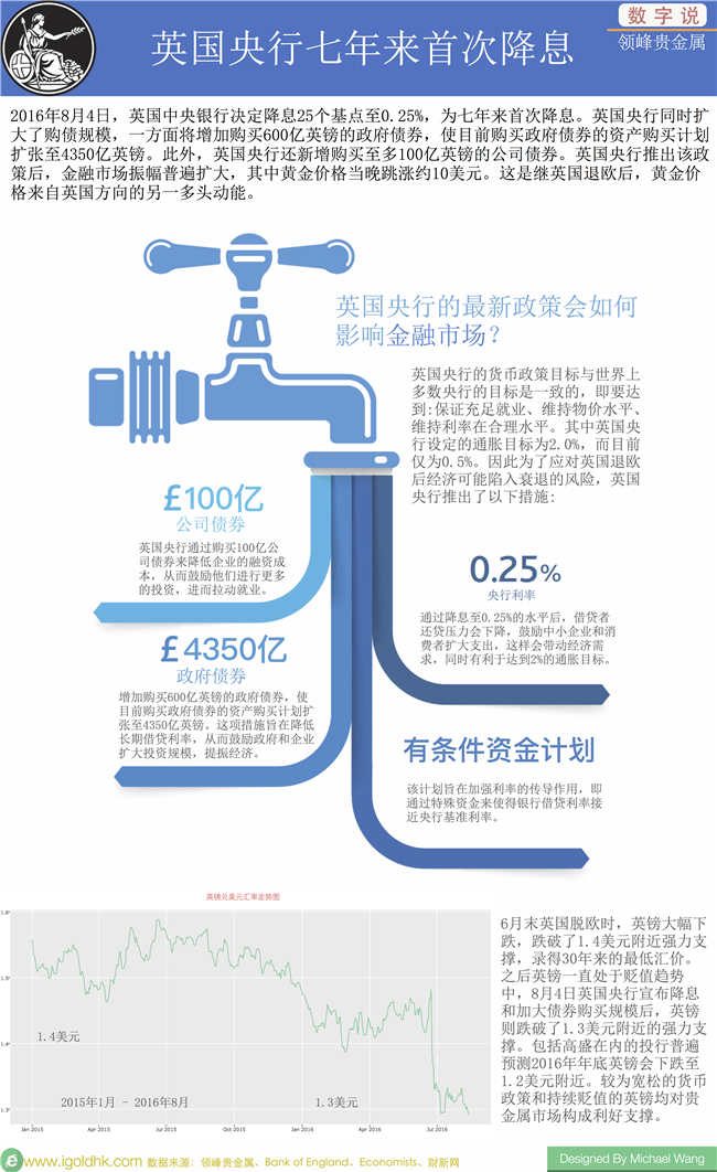 2016年8月4日英国央行公布议息决定后,英镑立即下跌1.38%,至1.31美元,黄金价格之后上涨近10美元,高位时触及至1365美元附近。随后的一周,英镑持续走跌,跌破了1.3美元附近强力阻力线。黄金价格虽然从高位回落,但是多头基础仍然牢固。英国央行降息之后,全球又多了一个央行实施宽松的货币政策。目前除了美联储偏于加息,收紧货币政策之外,全球主要经济体的央行均通过降准、降息或资产购买计划来提振经济。之前在专题《负利率下的黄金走势再探究》中我们已经就央行的负利率政策对金价的提振进行了分析,本篇专题中我们将会对英国央行刺激政策中的金价机遇进行分析。
