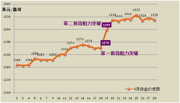 多头持稳背景下 非农令金价如何抉择---【非农攻略】整个6月份金价完成了筑底过程,整个6月份金价从1250美元附近先是突破1270美元阻力线,随后再次跃升超过1300美元阻力线,最终收尾在1310-1320美元区间。6月份涨幅约5.7%,目前的金价已经回升至了今年3月份的水平,即4至5月份两个月的全部跌幅全部被收复。在这样的多头背景下,非农数据的向好向坏对后期金价的走势都有非常重要的指引作用。一旦此次非农数据录得超过预期的话,市场或偏于下行,将是检测金价能否持稳1310和1300美元阻力线的关键;若非农低于预期,那么金价或上扬突破1320美元线。