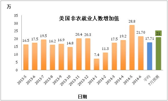 预期7月份公布的非农数据或仍旧高于过去一年的平均值17万,不过可能会低于6月份公布的21.7万。考虑到美国第一季度GDP萎缩了2%左右,且从5月份后公布的非农都是逐月下降的,所以预期此次非农数据或仍旧低于前月的数据,市场预测平均值为21万,不同投行给出的预测值范围在20.8-21.5万之间,只有金融时报给出的预测是23万,超过前个月的21.7万。