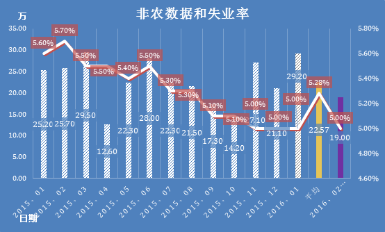 2016年1月份公布的非农数据录得29.2万,远高于当时市场的预期,且大幅超出平均值。但是尽管当时非农数据录得大幅向好,并没有给黄金价格带来空头压力。可见经过2015年的多次触底后,黄金价格本身的反弹动能具有内生性,即基本面上投资者认为黄金价格的合理水平应该是在1100美元以上。此外,1月份较高的非农数据并不能持续,即总体上,非农数据录得逐渐收平的趋势会更加明显,即除非出现一些不可抗因素,如极端恶劣天气,美国非农数据每月或稳定在平均值22万上下。随着美国经济复苏比较稳健,就业市场运行会更加平稳,同时因为失业率已经连续三个月稳定在5.0%,失业率没有大幅下降之前,非农新增就业人数保持高位增加的难度较大。