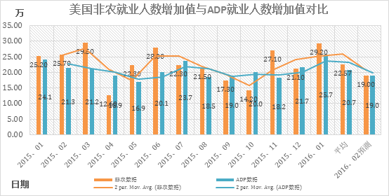 1月公布的ADP就业人数为25.7万,小幅低于当时的非农数据,但是两者攀升的趋势却是一致的。另外,ADP数据均值为20.7万,而非农数据均值为22.5万,两者差距不大。这意味着ADP数据对非农数据的参考价值在上升,即投资者可根据ADP数据上下调整1-2万来提前预估非农数据。其实美国经济越是稳定,失业率逐渐走低时,ADP数据与非农数据之间的差值一般会逐渐缩小。因为当经济不断企稳时,无论是私营企业就业人数增加值(ADP数据)还是非农就业人数增加值都会随着企业平稳的扩张速度而稳步增加,大幅波动的情况会更加少见。