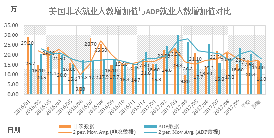2017年9月初公布的ADP就业人数为23.7万,远高于当时的非农数据。过去两个月,ADP数据和非农数据的偏差较大,使得ADP对非农数据的指导意义有所下降。目前ADP数据均值约20万,而非农数据均值约17.6万,两者差值有所扩大。市场预期本月ADP数据或录得16万,略低于非农预测。ADP数据公布后,投资者可以在此基础上下调整2-3万对非农数据进行预测。