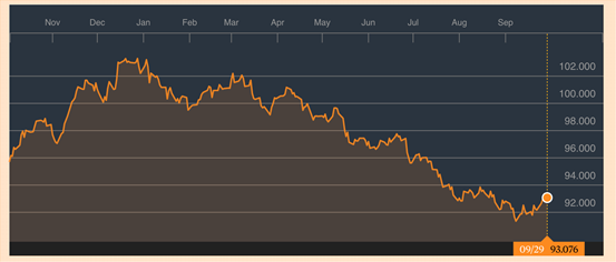 美元指数9月份完成了触底反弹的过程,此前美指一路下行跌破支撑。因为美联储公布了缩表进程,所以美指反弹重回93以上区间。2017年1月份以来,美元指数便逐渐从101附近高位下行至93附近运行,经过近半年的区间调整后,中期美元指数或已经完成了触底过程。未来美指可能会有所反弹,高位如果重回94和95附近,那么金银价格空头可能会再次增加。