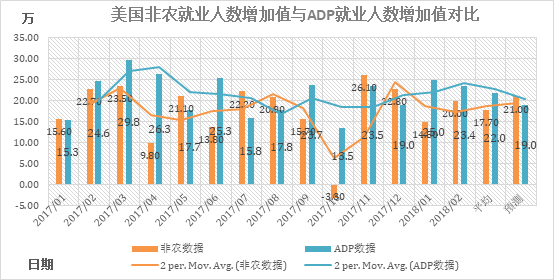 2018年2月初公布的ADP就业人数为23.4万,高于前值和市场预期。2月份时,ADP数据与非农数据的差距有所缩小。目前ADP数据均值约22万,而非农数据均值约18万。市场预期本月ADP数据或录得19万,与非农数据的预测值相差不大。ADP数据公布后,投资者可以在此基础上进行上下调整1-2万对非农数据进行预测。