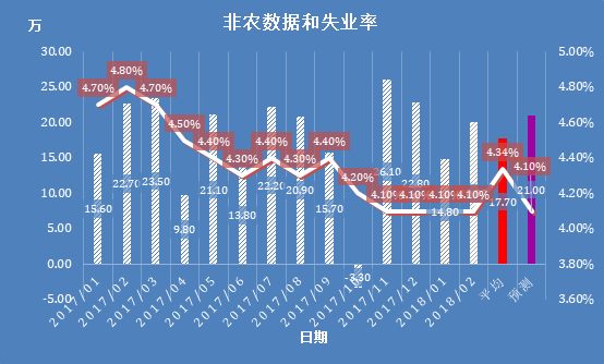2018年2月份非农录得20万,高于市场前值,也高于平均值。非农数据的反弹,使得贵金属市场空头有所增加,一定程度上触发了贵金属市场的高位回调。但是由于美国经济持续向好,所以非农数据的波动,并不能进一步反映美国经济的基本面,所以这使得非农数据的影响力有所下降。市场预期本月非农公布的数据或录得21万,与前值和均值相差不大,预期数据公布后,金银价格多空大幅调整的概率较低。